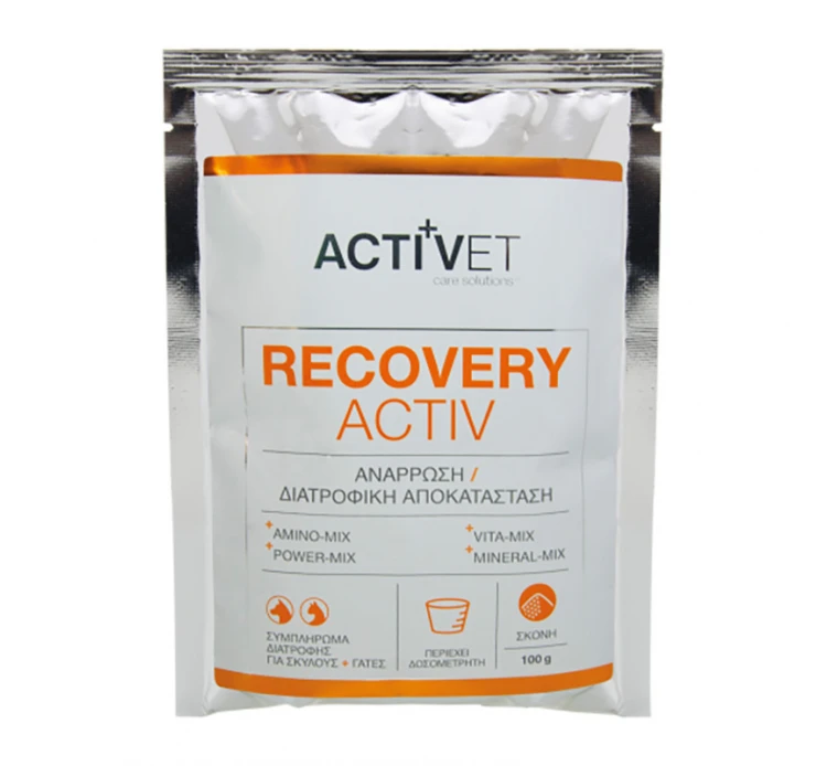 Το RECOVERYACTIV είναι ένα συμπλήρωμα διατροφής το οποίο δημιουργήθηκε από κτηνιάτρους και διατροφολόγους με πρότυπο τα συμπληρώματα διατροφής για τους επαγγελματίες αθλητές. Η υψηλής ποιότητας υδρολυμένη πρωτεΐνη πουλερικών, που χρησιμοποιείται, χαρακτηρίζεται από βιολογική αξία BV = 56% και πραγματική πεπτικότητα TD = 100%. Το RECOVERYACTIV χορηγείται για τη διατροφική αποκατάσταση του οργανισμού κατά τη περίοδο της ανάρρωσης των σκυλάκου ή της γατούλας σας και η μοναδική σύνθεσή του επιταχύνει την αποκατάσταση του οργανισμού, αυξάνει τη δύναμη και την αντοχή, προάγει την υγεία, χτίζει τους μυς και ενισχύει τις αρθρώσεις.