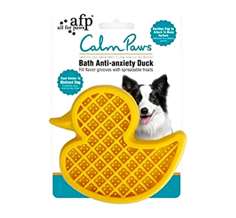 Παιχνίδι παπάκι για να κρατήσετε απασχολημένο το σκυλάκι σας κατά τη διάρκεια του μπάνιου. Έχει βεντούζες για να το κολλήσετε στα πλακάκια του μπάνιου ή σε όποια λεία επιφάνεια θέλετε. Στις ειδικές εσοχές του μπορείτε να βάλετε την αγαπημένη λιχουδιά του σκυλάκου σας και έτσι να απασχοληθεί όσο εσείς θα τον κάνετε μπάνιο. Μπορείτε επίσης να το παγώσετε πριν τη χρήση ώστε να έχει μεγαλύτερη διάρκεια. Το παιχνίδι αυτό είναι ένας έξυπνος τρόπος να βοηθήσετε το μικρό μας φίλο να μειώσει το στρες του σε καταστάσεις που τον αγχώνουν, όπως το μπάνιο ή το κόψιμο των νυχιών.
