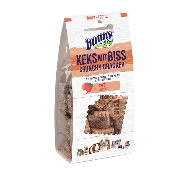 Τραγανά μπισκότα με μήλο, για όλα τα τρωκτικά. Παρασκευάζονται χωρίς προσθήκη ζάχαρης, συντηρητικά και χρωστικές. Περιέχουν ινουλίνη που είναι χρήσιμη για τον έλεγχο των επιπέδων σακχάρου στο αίμα και για τη διατήρησή του σε υγιές επίπεδο, καθώς και για την υγεία της εντερικής χλωρίδας. Μπορείτε να τα προσφέρετε στους μικρούς μας φίλους ως λιχουδιά μεταξύ των γευμάτων.