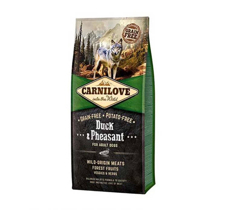 Πλήρης ολιστική τροφή χωρίς σιτηρά με πάπια και φασιανό για το ενήλικο σκυλάκι σας. Υψηλής ποιότητας διατροφή, πλούσια σε πρωτεΐνες υψηλής ποιότητας σε συνδυασμό με λιπαρά οξέα. Η σύνθεση της Carnilove για ενήλικους σκύλους μοιάζει πολύ με την αρχική φυσική διατροφή των σκύλων, που περιλαμβάνει κυρίως κρέας, εντόσθια και οστά που λαμβάνονται από το θήραμα, σε ισορροπία με τη σωστή αναλογία άγριων μούρων, λαχανικών και βοτάνων. Το κρέας άγριας προέλευσης και το λίπος παρέχουν όλα τα θρεπτικά συστατικά που είναι απαραίτητα για τους ενήλικους σκύλους ώστε να διατηρούνται σε άριστη φυσική κατάσταση και να έχουν ένα υγιές ανοσοποιητικό σύστημα. Το κρέας πάπιας είναι μία ιδανική πηγή πρωτεϊνών πλούσια σε πολυακόρεστα λιπαρά οξέα, τα οποία έχουν την ικανότατα να μειώνουν τα επίπεδα της χοληστερόλης στο αίμα. Επίσης περιέχει σημαντικά ποσοστά νιασίνης (βιταμίνης Β3), η οποία διαδραματίζει σημαντικό ρόλο στις μεταβολικές διεργασίες του οργανισμού, ενώ παράλληλα μειώνει τα επίπεδα χοληστερόλης στο αίμα. Το κρέας πάπιας περιέχει βιταμίνες Α και C, καθώς και σημαντικά ανόργανα συστατικά, όπως ο σίδηρος, το ασβέστιο και το σελήνιο, ενώ ο φασιανός αποτελεί εξαιρετική πηγή βιταμίνης Β12, φωσφόρου και σελήνιου. Ο συνδυασμός πάπιας και φασιανού δημιουργεί μια διατροφικά ισορροπημένη και θρεπτική τροφή που περιέχει όλα τα απαραίτητα αμινοξέα.