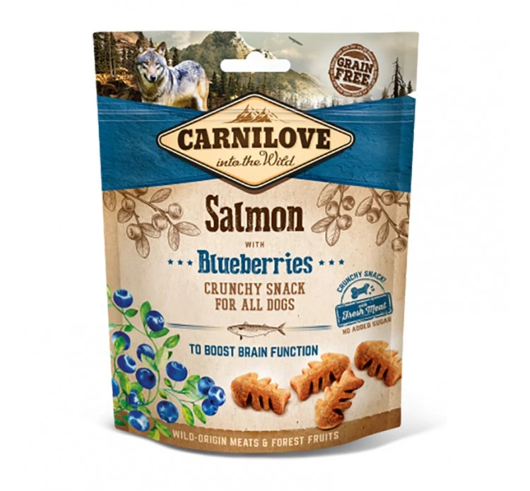 Τραγανά σνακ, για το σκυλάκι σας με σολομό και μύρτιλα. Εμπνευσμένο από τη διατροφή με κρέας άγριας προέλευσης. Χωρίς δημητριακά και πατάτα. Πλούσιο σε κρέας, φρούτα του δάσους και βότανα.Μπορείτε να του τα προσφέρετε είτε ως λιχουδιά είτε ως ανταμοιβή κατά τη διάρκεια της εκπαίδευσής του.
