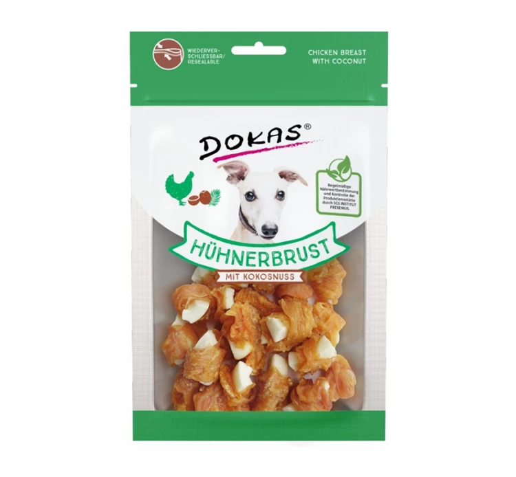 Λιχουδιές από κομμάτια καρύδας τυλιγμένα με φιλέτο στήθος κοτόπουλου, για το σκυλάκι σας. Το κοτόπουλο προσφέρει στο μικρό μας φίλο την απαραίτητη πρωτεΐνη που χρειάζεται ο οργανισμός του, ενώ η καρύδα είναι εξαιρετική πηγή για την ενίσχυση του ανοσοποιητικού συστήματος καθώς περιέχει αντιμυκητιασικές, αντιπαρασιτικές και αντιβακτηριδιακές ιδιότητες. Μπορείτε να τις προσφέρετε στο σκυλάκο σας είτε ως λιχουδιά στα πλαίσια μιας ισορροπημένης διατροφής, είτε ως επιβράβευση κατά τη διάρκεια της εκπαίδευσής του. Η συσκευασία τους είναι επανασφραγιζόμενη ώστε να διατηρούνται πάντα φρέσκες.
