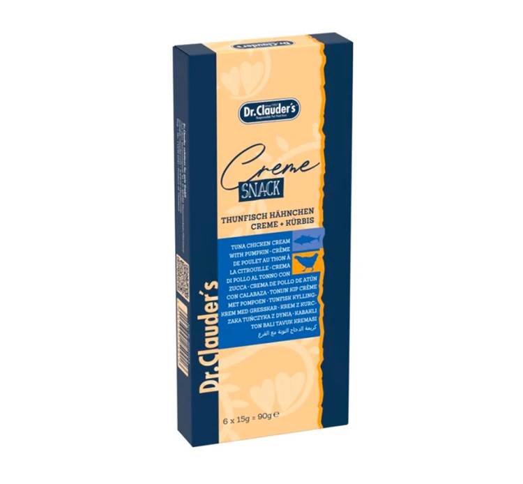 Λιχουδιά σε μορφή κρέμας, με τόνο, κοτόπουλο και κολοκύθα, για ενήλικους σκύλους και γάτες. Ο τόνος και το κοτόπουλο έχουν υψηλή περιεκτικότητα σε πρωτεΐνες και περιέχουν σίδηρο. Η κολοκύθα περιέχει βήτα-καροτίνη, η οποία έχει αντιοξειδωτική δράση. Είναι μια λιχουδιά που μπορείτε να προσφέρετε στους μικρούς μας φίλους με ποικίλους τρόπους: σκέτη ως λιχουδιά μεταξύ των γευμάτων, να την ανακατέψετε με την ξηρά τροφή ή κάποιο φάρμακο που δυσκολεύεται να καταπιεί. Μπορείτε επίσης να την απλώσετε σε παιχνίδια με ειδικές εσοχές ή επιφάνειες για λιχουδιές. Κάθε συσκευασία περιέχει 6 ατομικές μερίδες των 15gr.