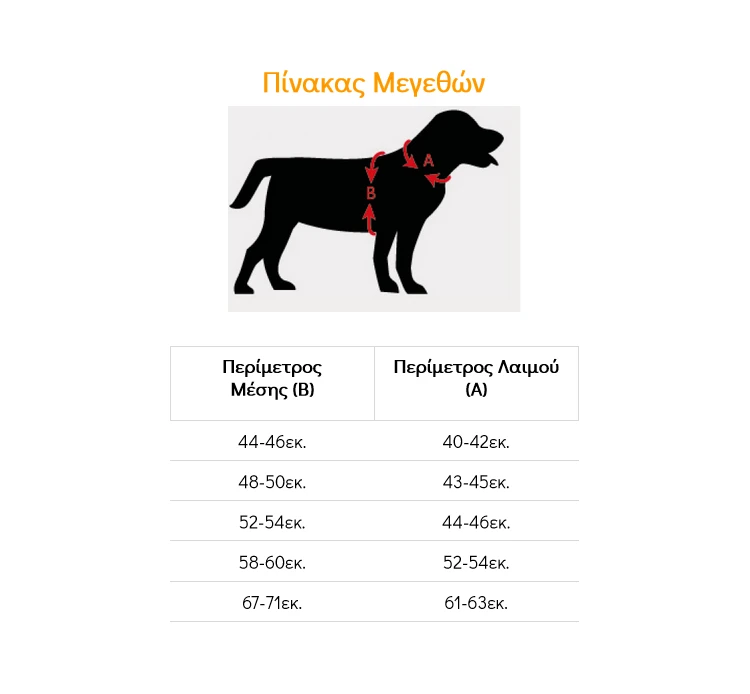 Για να επιλέξετε το σωστό μέγεθος για το σκυλάκι σας κάντε κλικ στο tab “Διαστάσεις”