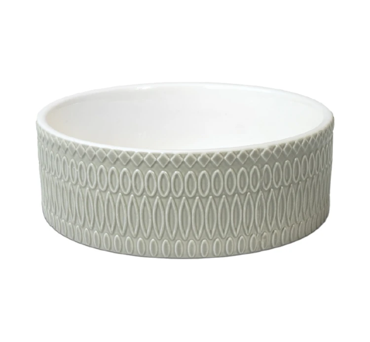 Κεραμικό μπολ με ανάγλυφο σχέδιο, για το νερό ή το φαγητό των μικρών μας φίλων. Είναι κατάλληλο για το φούρνο μικροκυμάτων και πλένεται στο πλυντήριο πιάτων. Διατίθεται σε διάφορα μεγέθη για να διαλέξετε το κατάλληλο για το σκυλάκι ή τη γατούλα σας.