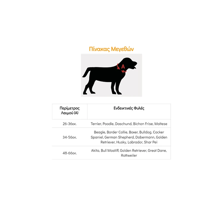 Για να επιλέξετε το σωστό μέγεθος για το σκυλάκι σας κάντε κλικ στο tab “Διαστάσεις”