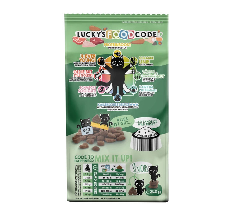 Η φιλοσοφία της σειράς Food Code πηγάζει από τις μελέτες του Ντα Βίντσι για τις ανθρώπινες αναλογίες, και αντανακλά την ομορφιά και την επίγνωση του σώματος στον κόσμο των γατών. Με κάθε πόδι, το αστρικό σώμα στη συσκευασία δείχνει ένα από τα 8 οφέλη που βοηθούν τη γατούλα σας να είναι υγιής και όμορφη. Από το κεφάλι μέχρι την ουρά, κάθε όργανο είναι σημαντικό, και αυτή είναι η ολιστική έννοια της υγείας!