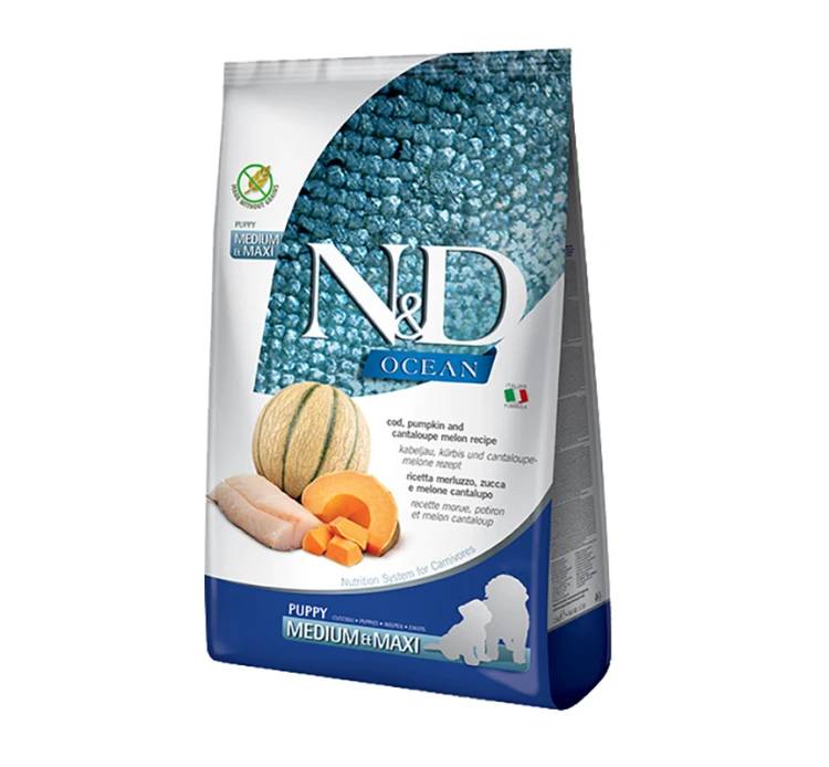 Πλήρης τροφή με μπακαλιάρο, κολοκύθα και πεπόνι, για το ανήλικο σκυλάκι σας μεσαίας ή μεγαλόσωμης φυλής και για εγκύες ή θηλάζουσες σκυλίτσες. Λόγω της απουσίας δημητριακών η τροφή έχει χαμηλό γλυκαιμικό δείκτη κι αυτό επιτρέπει τη σταδιακή απελευθέρωση ενέργειας καθ’ όλη τη διάρκεια της ημέρας, προωθώντας μια καλύτερη αντίδραση στην ινσουλίνη και λιγότερο στρες στο πάγκρεας. Η τροφή περιέχει επίσης χονδροϊτίνη και γλυκοζαμίνη που βοηθούν στην υγεία των αρθρώσεων καθώς και φρουκτοολιγοσακχαρίτες που βοηθούν στην ανάπτυξη των καλών βακτηριδίων του εντέρου. Πλούσια σε υψηλής ποιότητας πρώτες ύλες συμπεριλαμβανομένων πολύτιμων βιταμινών, που έχουν μεγαλύτερη αποτελεσματικότητα χάρη στην τεχνολογία ψυχρής έγχυσης. Η τροφή συσκευάζεται σε προστατευτική ατμόσφαιρα με τη χρήση αζώτου αντί για οξυγόνο και έτσι τα θρεπτικά συστατικά της διατηρούνται αναλλοίωτα με την πάροδο του χρόνου. Πρόκειται για μια γευστική τροφή, υψηλής βιολογικής αξίας, η οποία είναι πλούσια σε θρεπτικά συστατικά που ανταποκρίνονται στις ειδικές ανάγκες του σκυλάκου σας.