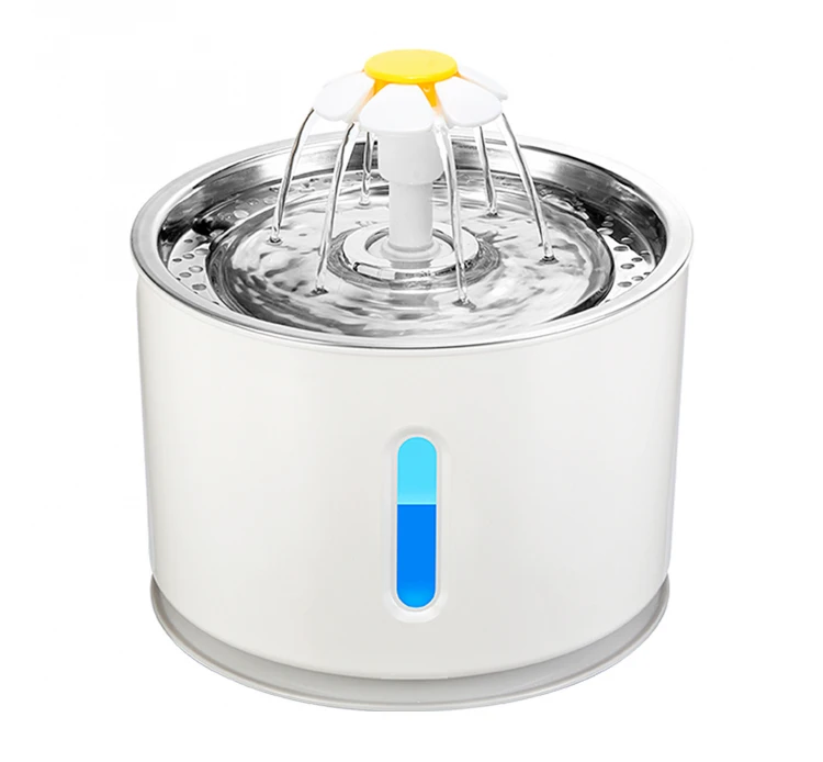 Συντριβάνι συνεχούς ροής, κατάλληλο για γατούλες και μικρόσωμα σκυλάκια. Ο ήχος του νερού ενθαρρύνει το μικρό μας φίλο να πίνει περισσότερο νερό, και ο φωτισμός Led τον χαλαρώνει. Έχει κυκλικό σύστημα ροής νερού για συνεχόμενη ροή και αθόρυβη αντλία με χαμηλή κατανάλωση ρεύματος, που νανουρίζει το σκυλάκι ή τη γατούλα σας. Η μέθοδος επεξεργασίας νερού είναι μέσω ανταλλαγής ιόντων για να διατηρείται η φρεσκάδα του νερού, και έχει σπόγγο και φίλτρο από βαμβάκι που περιέχει ενεργό άνθρακα και αρνητικά ιόντα ρητίνης. Τα φίλτρα με άνθρακα αφαιρούν τις δυσοσμίες, τα υπολείμματα & τις τρίχες από το νερό. Το συντριβάνι έχει επίσης “παραθυράκι” για να φαίνεται η στάθμη του νερού, ώστε να το συμπληρώνετε όταν χρειαστεί και μπορείτε να το πλύνετε στο πλυντήριο πιάτων. Είναι κατασκευασμένο από πλαστικό υψηλής ποιότητας για μακροχρόνια χρήση και το σχήμα του δίνει τη δυνατότητα στους μικρούς μας φίλους να πίνουν νερό από όλη την επιφάνεια του συντριβανιού. Η επιφάνεια αυτή είναι από ανοξείδωτο ατσάλι και είναι κατάλληλη για σκυλάκια και γατούλες που έχουν ευαισθησία στο πλαστικό υλικό. Το λουλουδάκι είναι βιδωτό και αναλόγως με το πόσο θα το βιδώσετε ρυθμίζετε και την ταχύτητα ροής του νερού. Διατίθενται επίσης ανταλλακτικά φίλτρα για την καλύτερη λειτουργία του. Στη συσκευασία περιλαμβάνεται καλώδιο usb.