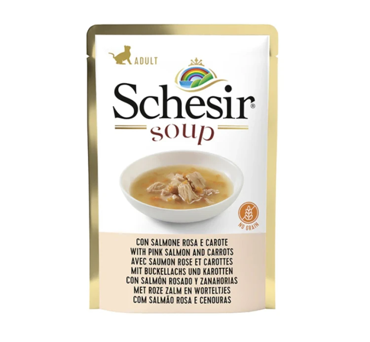 Σούπα με άγριο ροζ σολομό και καρότα, χωρίς σιτηρά, για την ενήλικη γατούλα σας. Πρόκειται για ένα έτοιμο γεύμα που μπορείτε να προσφέρετε στη μικρή μας φίλη με ποικίλους τρόπους: σκέτη ως λιχουδιά ή ως συμπλήρωμα στην καθημερινή της διατροφή, να υγράνετε την ξηρή τροφή της για μια πιο γευστική απόλαυση, να την ανακατέψετε με τις λιχουδιές της. Έτσι η γατούλα σας έχει έναν γευστικό λόγο να αναπληρώνει τις απώλειες υγρών και να ενυδατώνεται σύμφωνα με της ημερήσιες ανάγκες της!