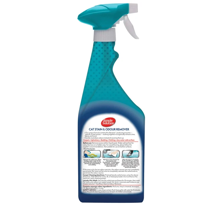 Σπρέι καθαρισμού και εξουδετέρωσης των λεκέδων και των οσμών που μπορείτε να χρησιμοποιήσετε σε όλες τις επιφάνειες. Η μοναδική σύνθεσή του με προ-βακτήρια που παράγουν ένζυμα αφαιρεί με ασφάλεια λεκέδες και οσμές (ούρα, κόπρανα και εμετό) από χαλιά, ταπετσαρίες, κλινοσκεπάσματα και ρούχα. Επιπλέον, αποτρέπει τη μικρή μας φίλη από το να επισκέπτεται αυτά τα σημεία. Αποφύγετε τη χρήση απευθείας πάνω στη γατούλα σας.