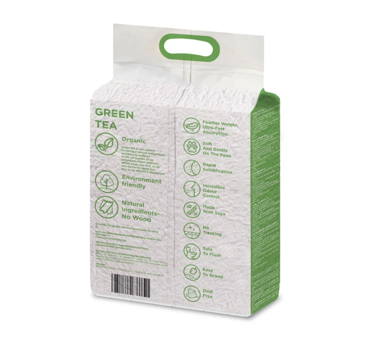 Φυτικό υπόστρωμα υγιεινής σε πέλλετ από 100% ίνες σόγιας, με εκχύλισμα πράσινου τσαγιού, για την τουαλέτα της γατούλας σας. Απορροφά πολύ γρήγορα τα ούρα, σε μόλις 1,5 δευτερόλεπτο, εμποδίζοντας την υγρασία να φτάσει στο κάτω μέρος της τουαλέτας αποτρέποντας έτσι την ανάπτυξη βακτηρίων. Εξουδετερώνει τις δυσάρεστες οσμές και είναι φιλικό προς τα πόδια της μικρής μας φίλης, ενώ το πράσινο τσάι έχει αντιβακτηριακές ιδιότητες. Δεν περιέχει συνθετικά πρόσθετα ή βαφές και είναι πλήρως φυσικό και βιοδιασπώμενο. Μπορείτε απλώς να πετάξετε τους σβώλους στη λεκάνη της τουαλέτας και έτσι δεν χρειάζεται να χρησιμοποιήσετε πλαστική σακούλα για να πετάξετε τις ακαθαρσίες. Επιπλέον, το πέλλετ δεν κολλά στις πατούσες της γατούλας σας και έτσι διατηρείτε το χώρο σας καθαρό.